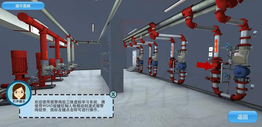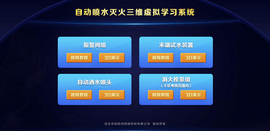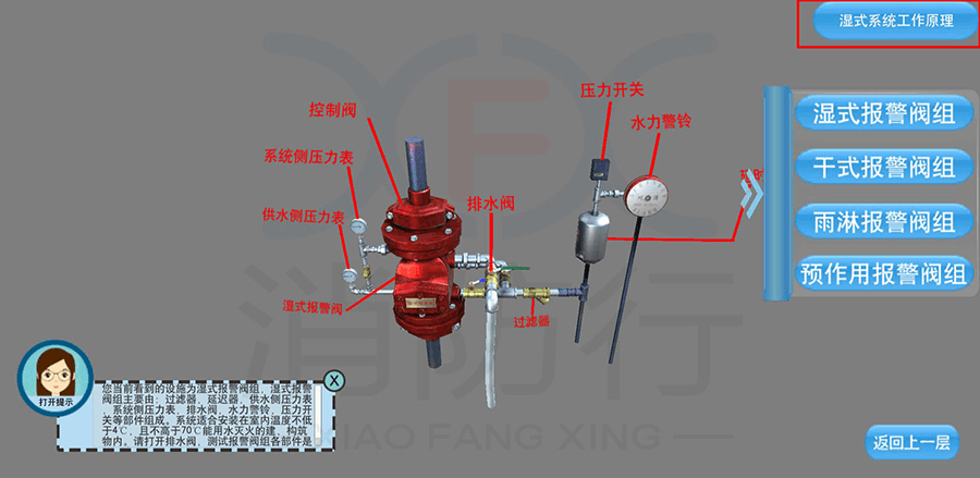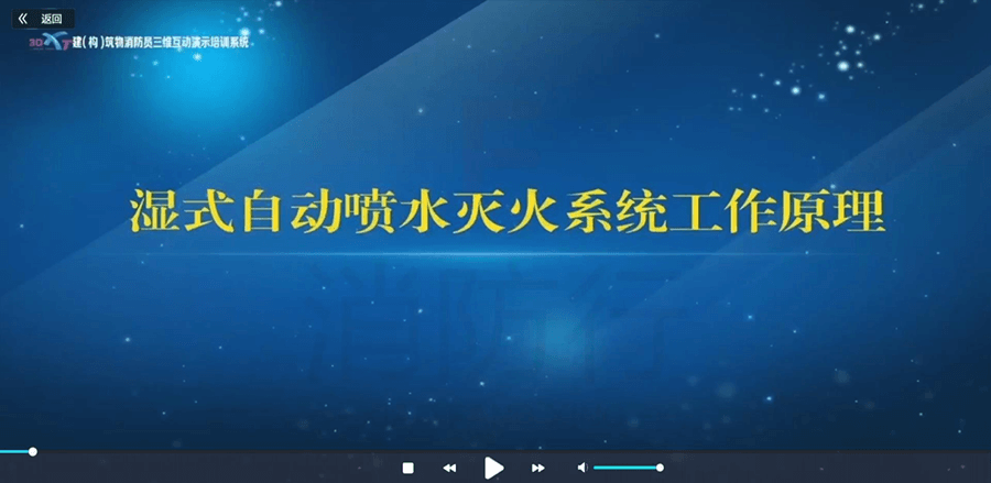 3D-PM自动喷水灭火三维虚拟学习系统可进入洒水喷头、报警阀组、水流报警装置等模块,通过文字介绍、视频介绍了解各种自动喷水灭火系统。学员可以在三维场景内使用4种报警阀组的操作,并可以在场景中学习8种自动洒水喷头的功能。